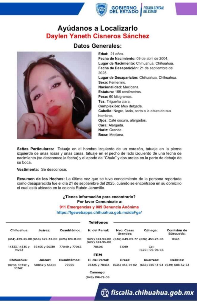 La Fiscalía de Chihuahua solicita ayuda para localizar a Daylen Yaneth Cisneros, de 21 años, desaparecida desde el 21 de septiembre en la colonia Rubén Jaramillo.