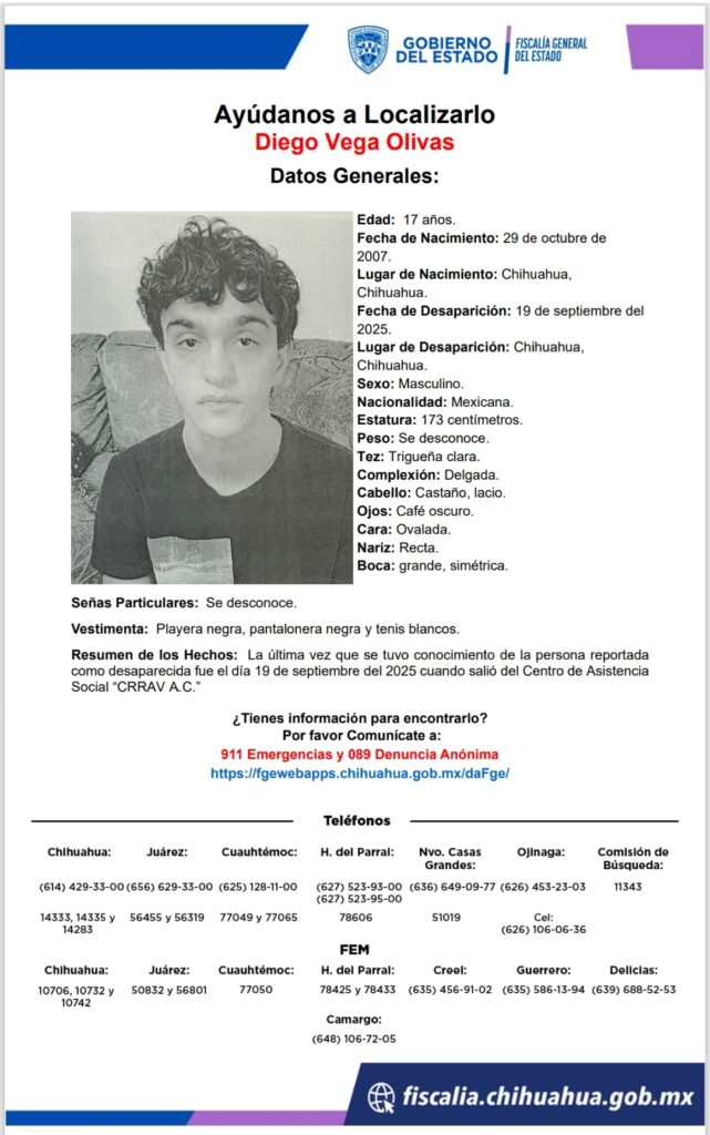 Diego Vega Olivas, un joven de 17 años, desapareció en Chihuahua el 19 de septiembre de 2025. Se solicita la colaboración de la comunidad para su localización.