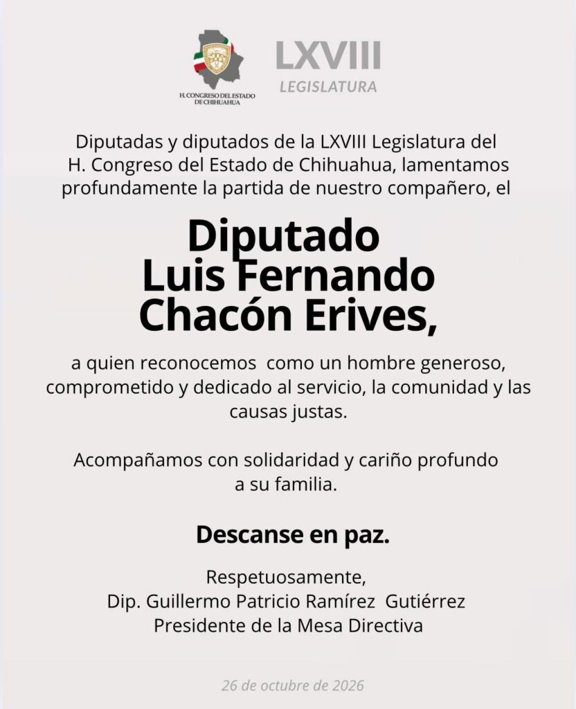 Diputados del Congreso de Chihuahua lamentan la muerte del legislador Luis Fernando Chacón Erives, recordándolo como un hombre comprometido y generoso.