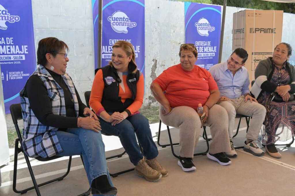 La Gobernadora de Chihuahua, Maru Campos, entrega vales de menaje a madres de familia afectadas por inundaciones, apoyando su recuperación tras el temporal lluvioso.