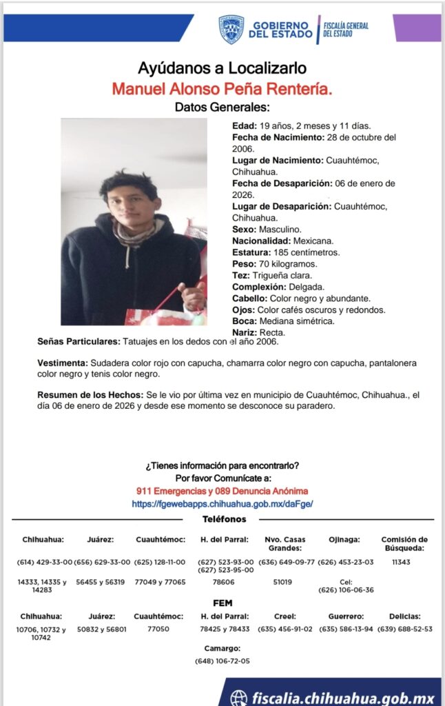 Manuel Alonso Peña Rentería, de 19 años, desapareció en Cuauhtémoc, Chihuahua. Se busca información sobre su paradero. Comunícate si tienes datos.