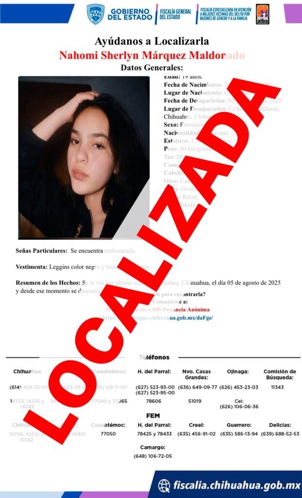 La Fiscalía Especializada confirmó la localización de una joven de 18 años reportada como ausente en Nuevo Casas Grandes. No fue víctima de delito alguno.