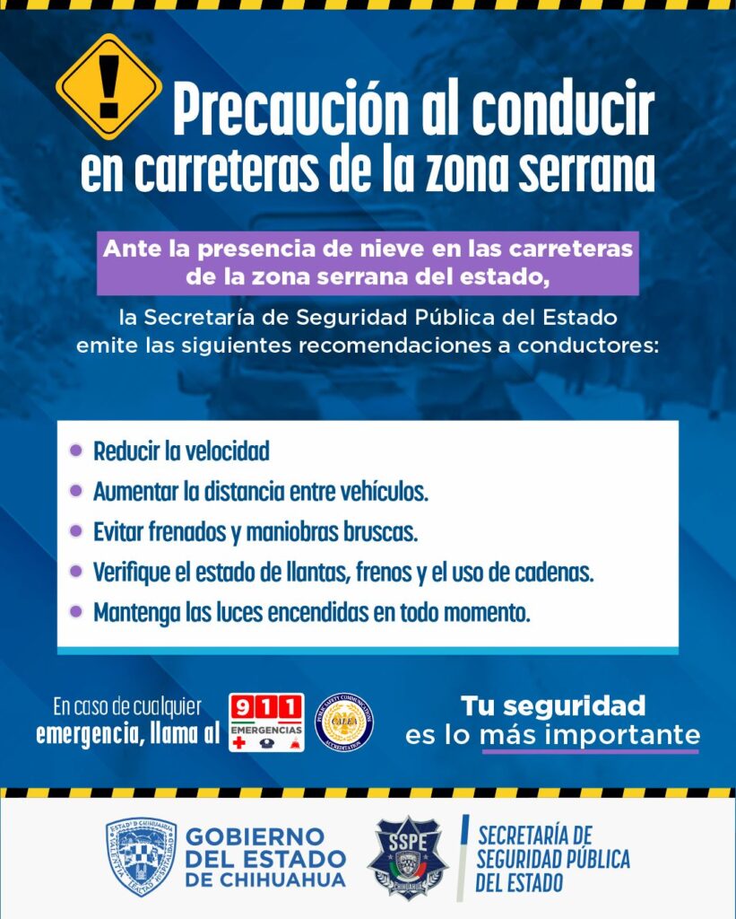 La CEPC mantiene alerta preventiva por nieve y aguanieve en Chihuahua. Se recomienda precaución en el regreso a clases y en el uso de calefactores.