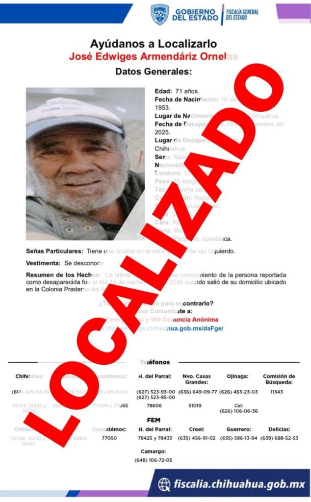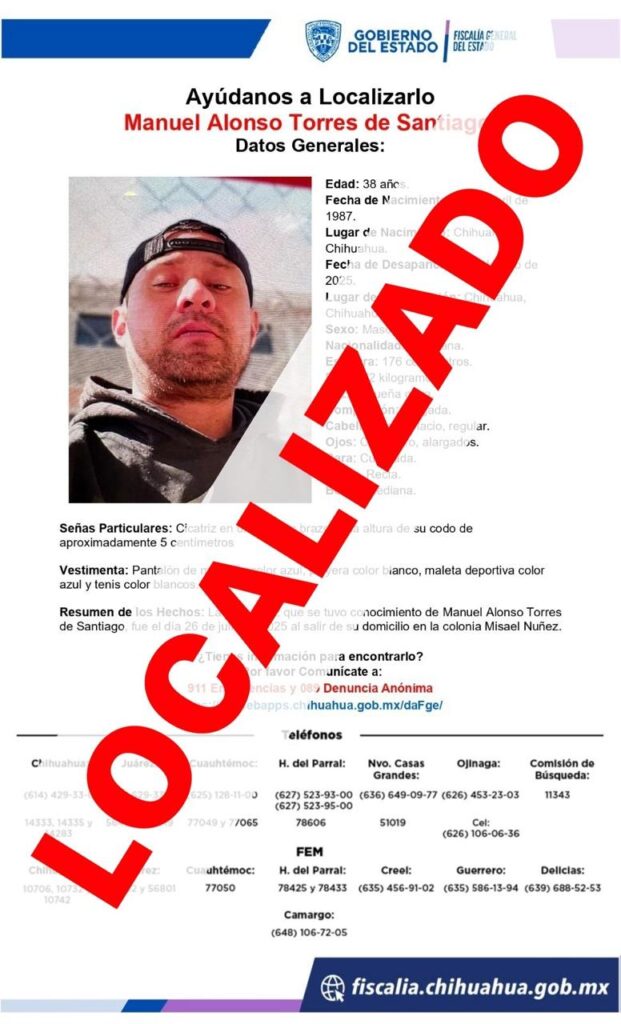 La Fiscalía de Chihuahua informa sobre la localización de Manuel Alonso T. S., quien había sido reportado como ausente desde el 15 de agosto. Su ausencia fue voluntaria.