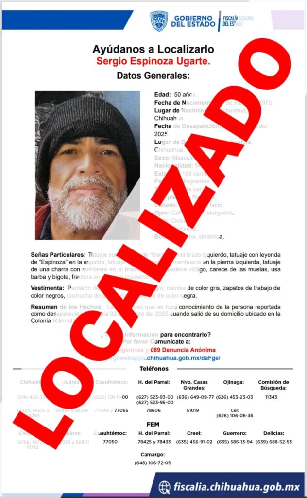 La Fiscalía de Distrito Zona Centro encontró a Santos N. A., de 42 años, quien había sido reportado como ausente en Delicias. Se encuentra sano y salvo.