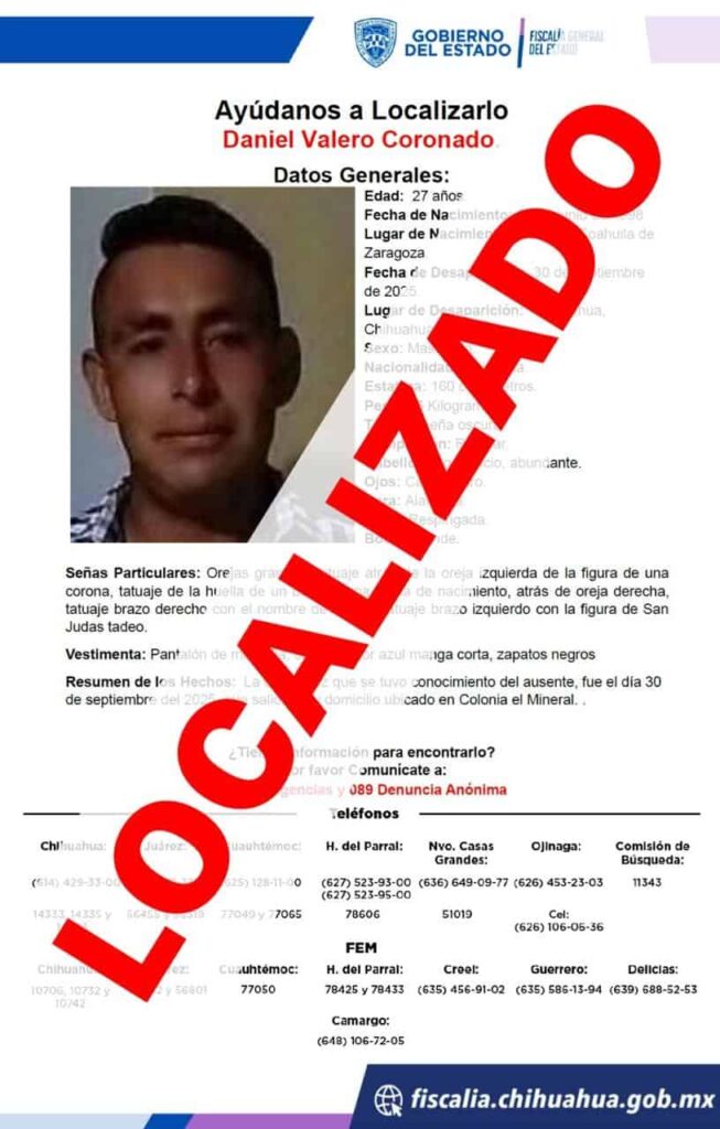 La Fiscalía de Chihuahua localiza a Daniel Valero C., de 27 años, quien había sido reportado como ausente. Se encontraba en buen estado de salud tras su desaparición voluntaria.