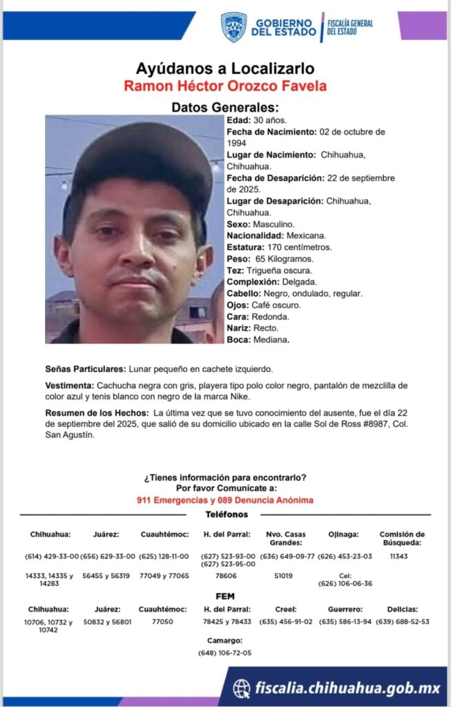 Se solicita apoyo para localizar a Ramón Héctor Orozco Favela, desaparecido desde el 22 de septiembre de 2025 en Chihuahua. Cualquier información es valiosa.