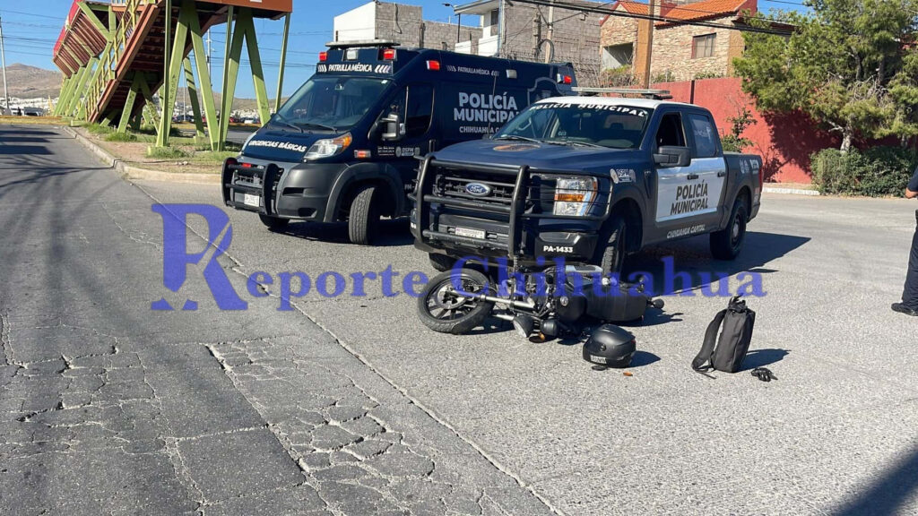 Un motociclista resultó lesionado tras ser impactado por una patrulla de la Policía Municipal en la colonia Paseos de Chihuahua. Fue trasladado a un hospital para valoración médica.