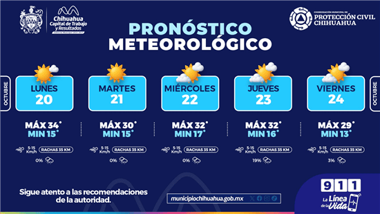 El Gobierno Municipal de Chihuahua informa sobre el clima de la semana, que incluirá días soleados y probabilidad de lluvia hacia el jueves y viernes.