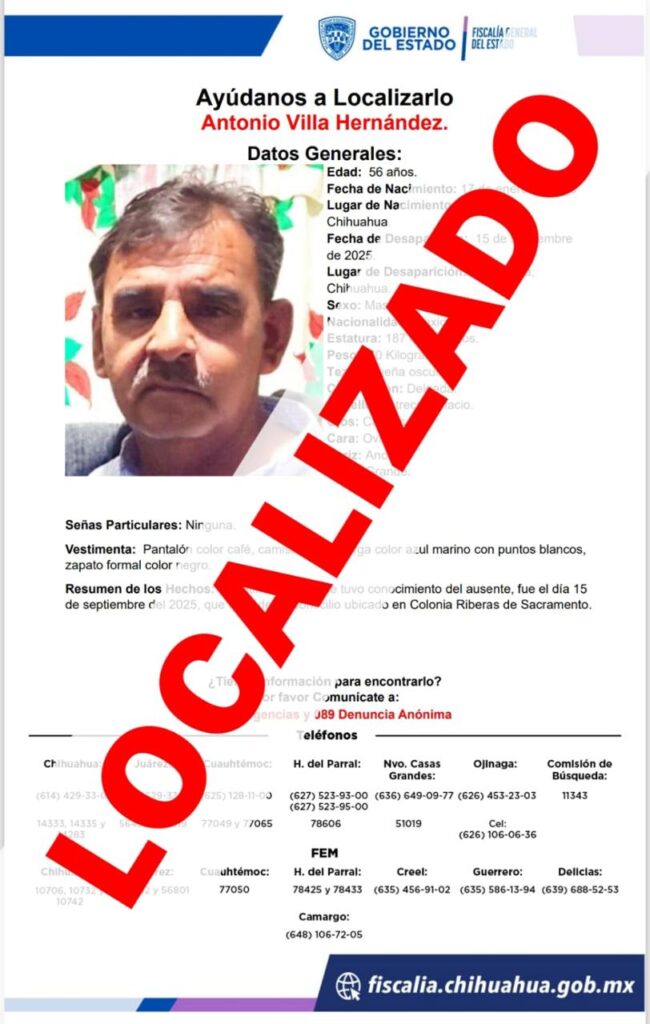 La Fiscalía localizó sano y salvo a Antonio V. H., de 56 años, quien había sido reportado ausente en Chihuahua. Su familia había perdido contacto con él desde el 15 de septiembre.