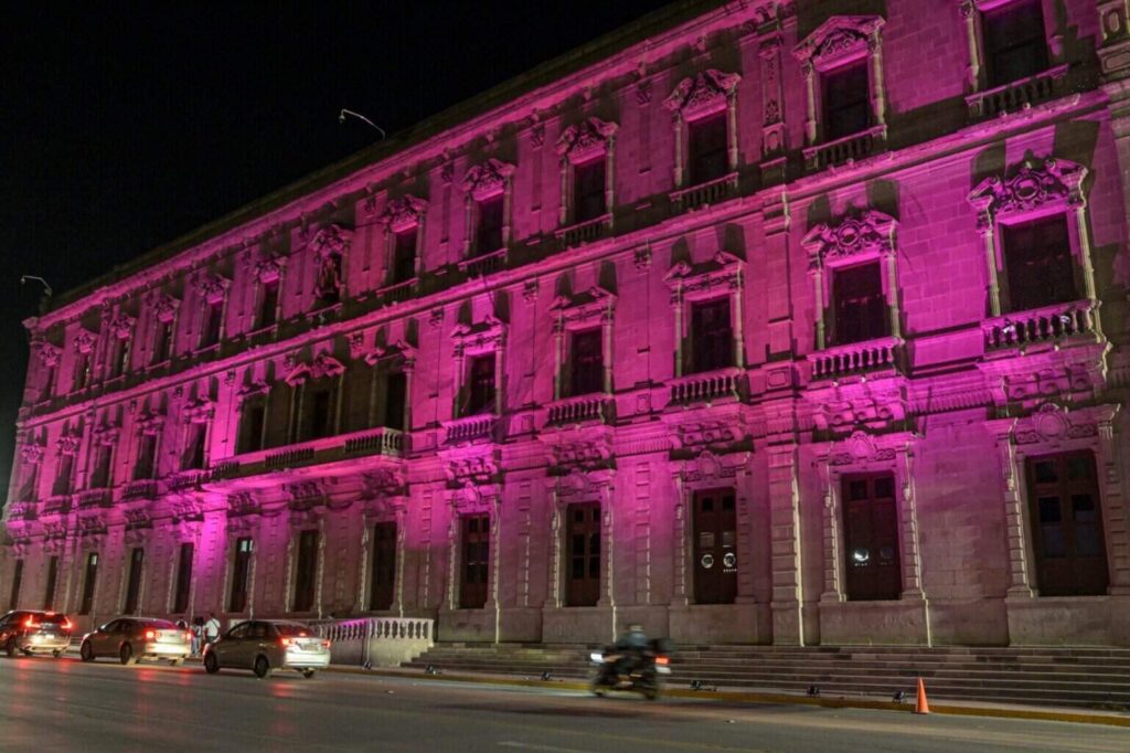El Palacio de Gobierno de Chihuahua se ilumina de rosa en conmemoración del Día Internacional contra el Cáncer de Mama, destacando la importancia de la prevención y detección oportuna.
