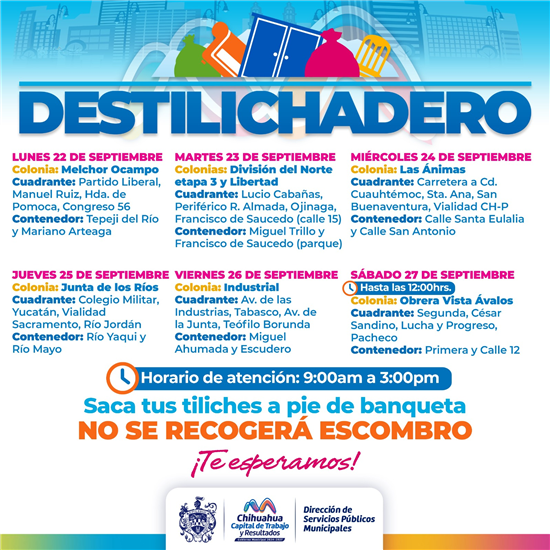 El Gobierno Municipal de Chihuahua implementará el programa Destilichadero del 22 al 27 de septiembre, facilitando la recolección de basura de grandes dimensiones en siete colonias de la ciudad.