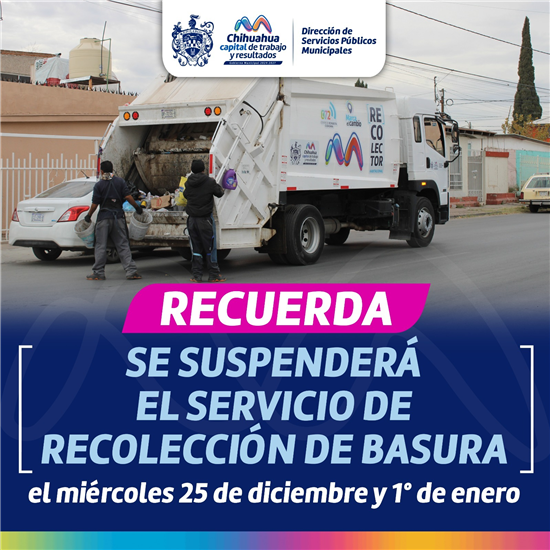 El Gobierno Municipal de Chihuahua informa sobre la suspensión del servicio de recolección de basura los días 25 de diciembre y 1 de enero debido a las festividades decembrinas.