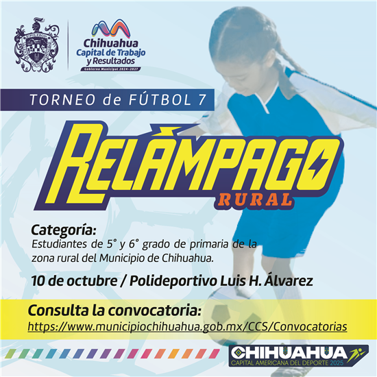 El Municipio de Chihuahua lanza la convocatoria para el Torneo de Fútbol 7 'Relámpago Rural', dirigido a escuelas primarias de la zona rural. Inscripción gratuita para alumnos de 5° y 6° grado.