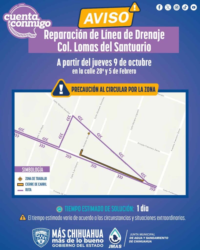 La Junta Municipal de Agua y Saneamiento de Chihuahua realizará reparaciones en un tramo de drenaje en la colonia Lomas del Santuario el 9 de octubre, afectando el tráfico en la zona.