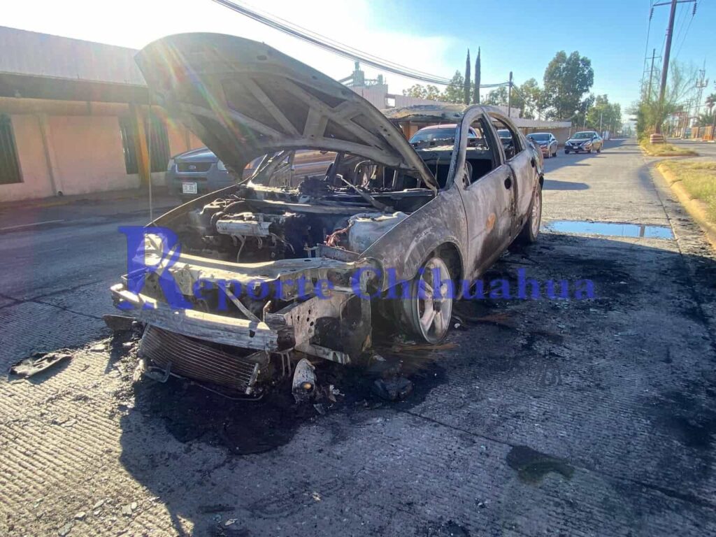 Esta mañana se reportó un vehículo calcinado en el cruce de avenidas en Chihuahua. Se trata de un Dodge Stratus rojo, sin ocupantes y con daños significativos.