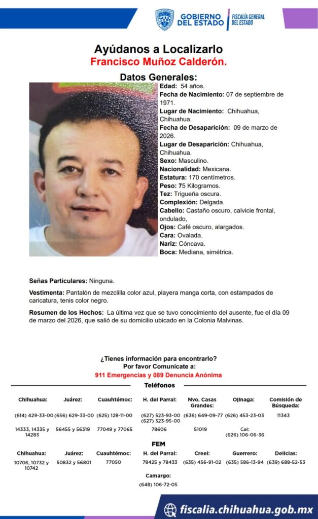 Las autoridades han instado a la ciudadanía a colaborar en la búsqueda de Francisco Muñoz Calderón, quien fue visto por última vez el 9 de marzo de 2026. El hombre de 54 años desapareció de su domicilio en la Colonia Malvinas, Chihuahua.