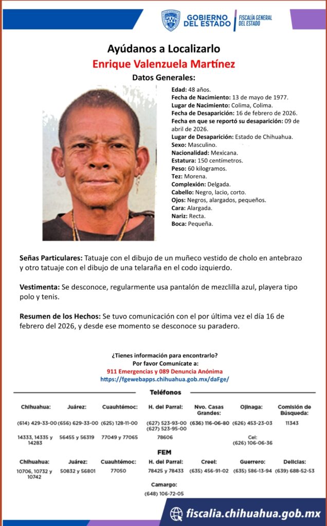 Enrique Valenzuela Martínez, un hombre de 48 años, fue reportado como desaparecido el 9 de abril de 2026. La última vez que se tuvo comunicación con él fue el 16 de febrero de 2026 en el estado de Chihuahua.