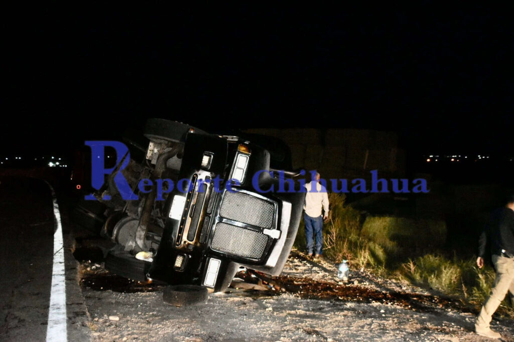 Un tráiler que transportaba pacas de pastura volcó esta tarde en la carretera libre que conduce de Chihuahua a Ciudad Juárez, a la altura del kilómetro 12. El incidente ocurrió cuando el conductor perdió el control del vehículo debido a la falta de pericia, lo que provocó que el tracto camión volcara y quedara recostado sobre su lado izquierdo.